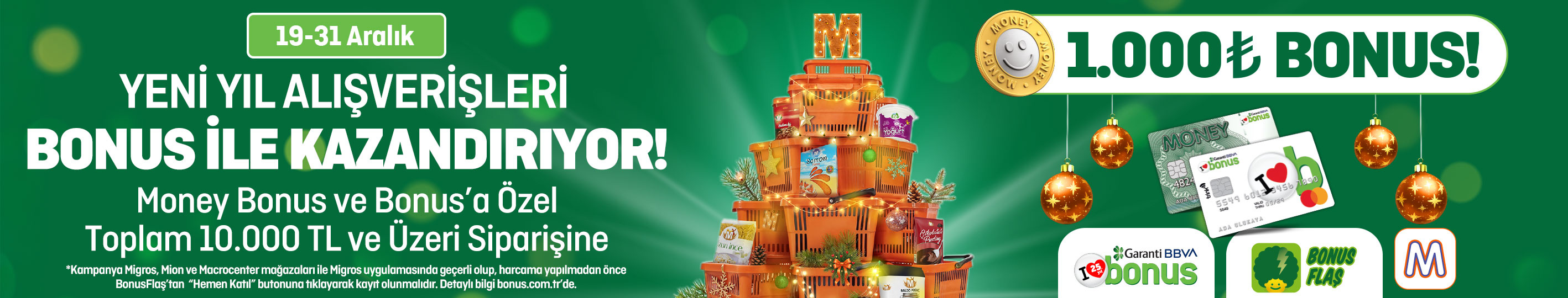 - Migros,5M Migros, Migrosjet, Macrocenter ,Petimo ve Mion mağazalarından veya Migros Sanal Market , Migros Ekstra, Migros Hemen, Macroonline, Miononline, Tazedirekt sanal mağazalarından toplam 10.000 TL ve üzeri alışverişlerde 1.000 TL bonus kazanabilirsiniz.