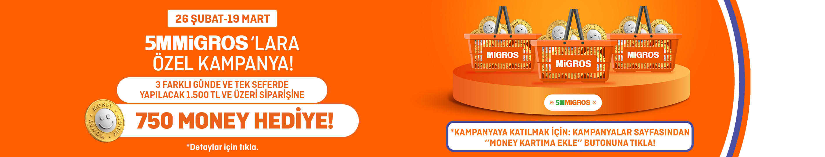 - 26 Şubat – 19 Mart 2026 tarihleri arasında 5M Migros’lardan kayıtlı Money veya Money Bonus ile 3 farklı günde ve tek seferde yapılacak 1.500 TL ve üzeri alışverişine 750 Money hediye edilecektir.