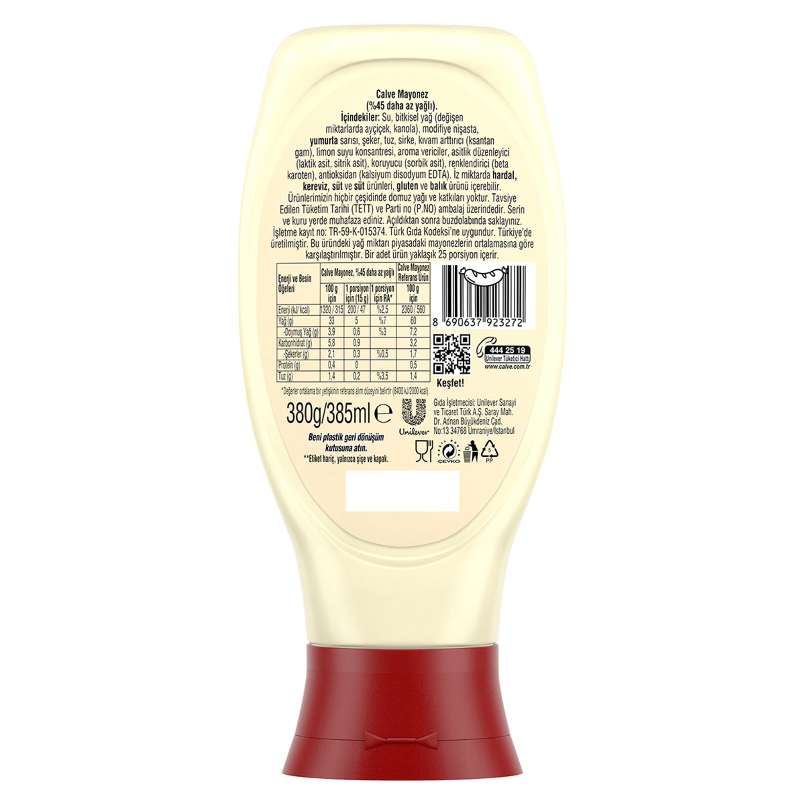 Calve Mayonez (%45 daha az yağlı). İçindekiler: Su, bitkisel yağ (değişen miktarlarda ayçiçek, kanola), modifiye nişasta, yumurta sarısı, şeker, tuz, sirke, kıvam arttırıcı (ksantan gam), limon suyu konsantresi, aroma vericiler, asitlik düzenleyici (laktik asit, sitrik asit), koruyucu (sorbik asit), renklendirici (beta karoten), antioksidan (kalsiyum disodyum EDTA).