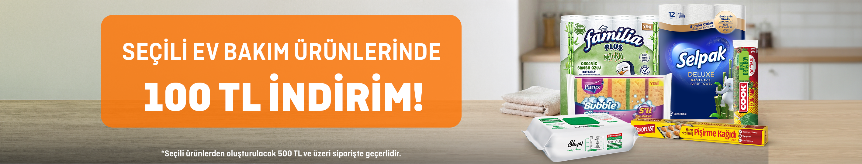 - Kampanya seçili Ev Bakım ürünlerinden oluşturulacak 500 TL ve üzeri siparişte 100 TL indirim sağlar.