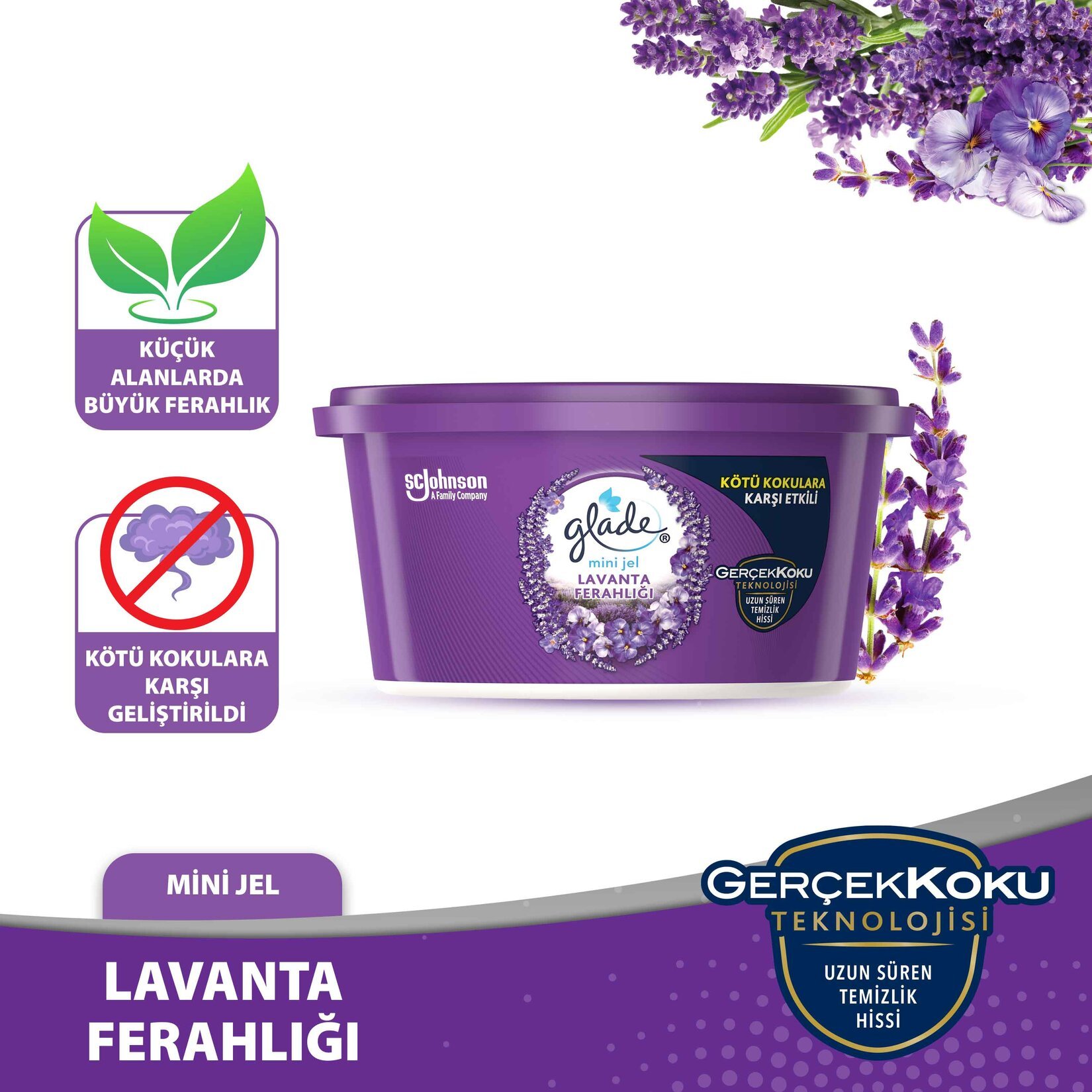 Glade Mini Jel Lavanta Ferahlığı çekmece, dolap içi, kiler ve banyo gibi küçük alanlar için ferahlık sağlar. Lavantanın çiçeksi hoş kokusu huzurla rahatlamanızı sağlar. Küçük alanlarda büyük ferahlık sağlar. Ayarlanabilir koku seviyesi ile kolay kullanım sağlar. Parfüm yoğunluğunu ayarlamak için üst kapağı çevirerek kaldırmanız veya indirmeniz yeterlidir. Glade Mini Jel, evinizdeki küçük alanları ferahlatmanın pratik, kolay, kalıcı ve hesaplı bir yolunu sunar, ferahlık ve temizlik hissi sağlar. Dilediğiniz yere yerleştirin ve anında ferahlığın keyfini çıkarmaya başlayın!