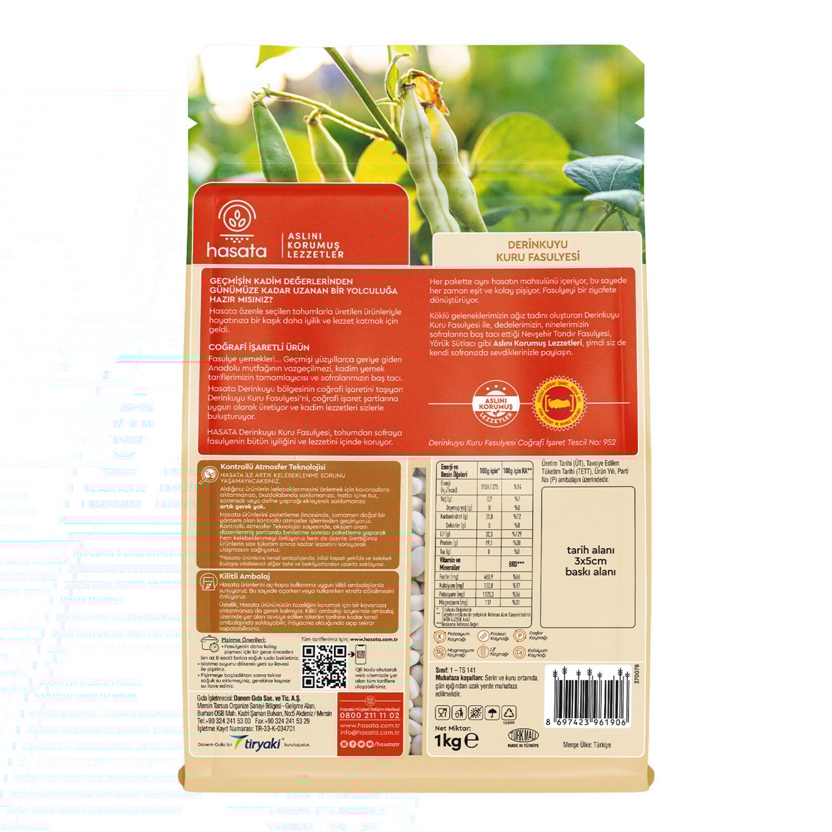 Çabuk pişen ve pişerken dağılmayan, yetiştirildiği bölge olan Nevşehir Derinkuyu’nun coğrafi işaretli üretim şartlarını karşılayarak üretilen Hasata Derinkuyu Kuru Fasulyesi aynı zamanda potasyum, protein, magnezyum, kalsiyum, fosfor ve lif kaynağıdır.