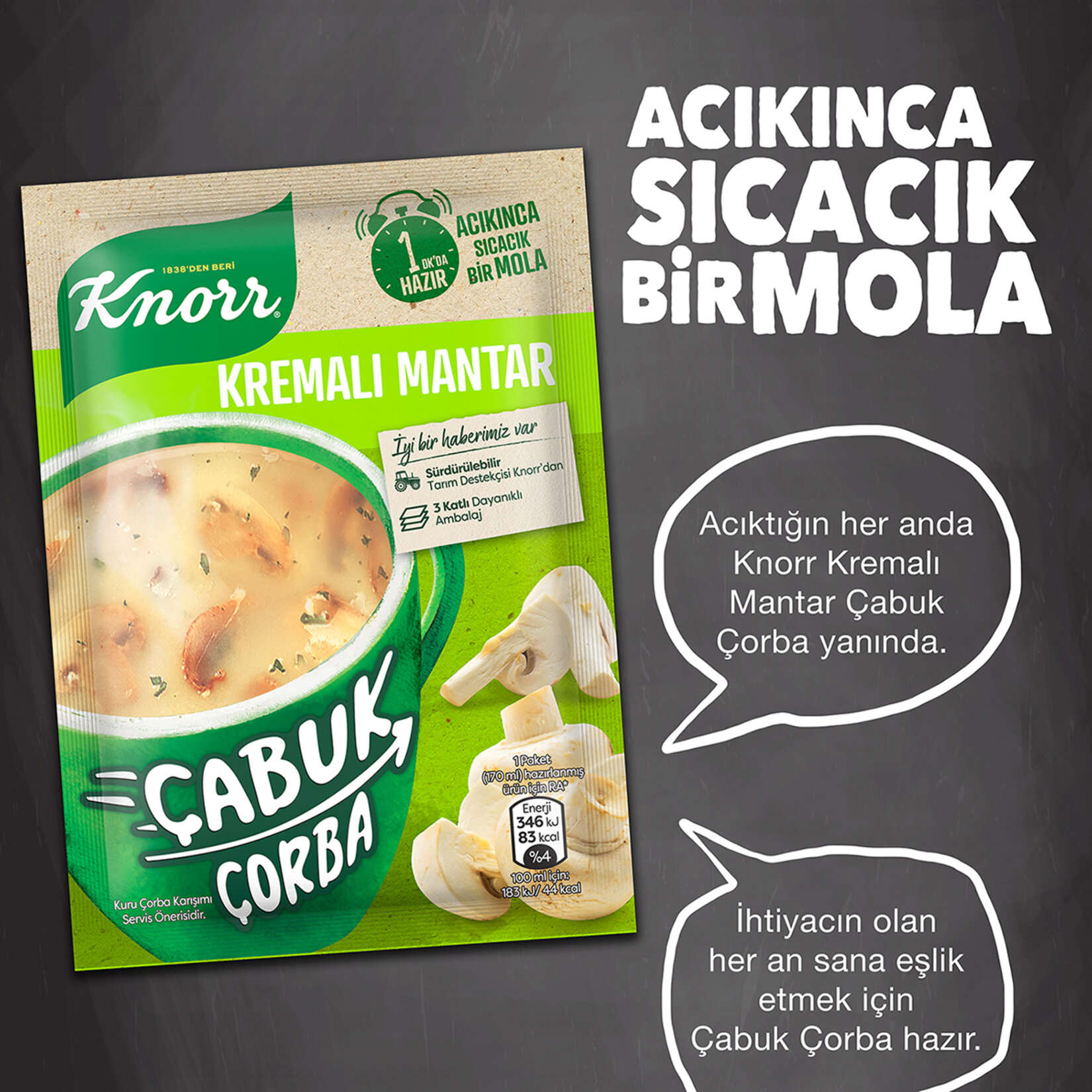 Acıktığın her yerde ve her anda, Knorr Çabuk Kremalı Mantar yanında! Knorr Çabuk Çorba ile çabuk ol, hayatı yakala! Haydi, sen de Knorr Çabuk Kremalı Mantar’ı dene.