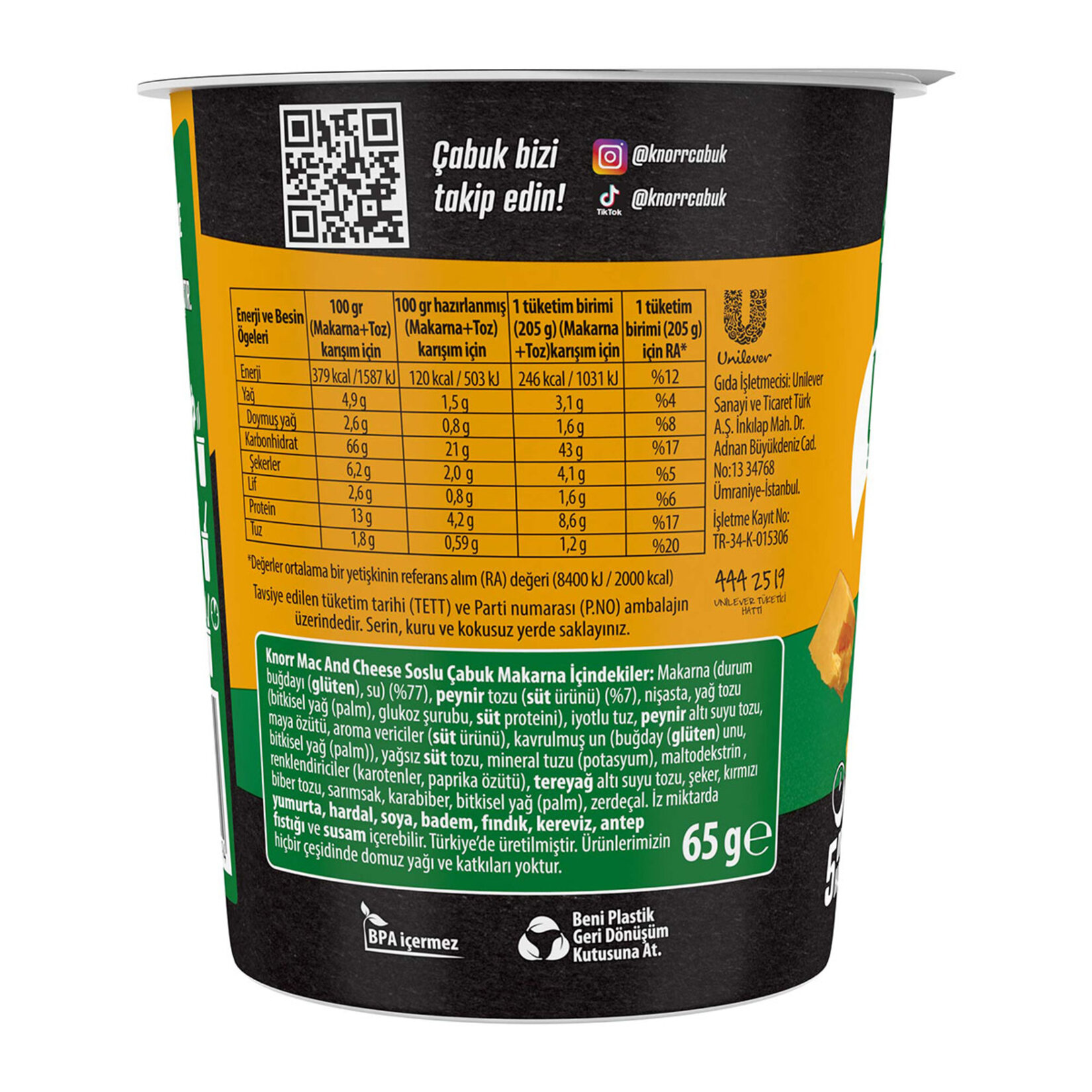 40000000070300/40000000070302/40000000072911Anasayfa Temel Gıda Makarna Makarnalar Knorr Çabuk Makarna Mac & Cheese (Bardak) 65 G Knorr Çabuk Makarna Mac & Cheese (Bardak) 65 G Knorr Ürün ÖzellikleriÜrün AçıklamasıBesin DeğerleriÜrün Bilgileri