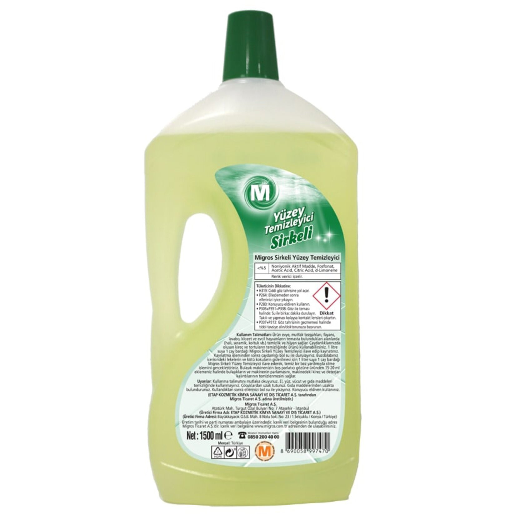 Güçlü formül ile üretilmiş olan Migros Yüzey Temizleyici, fayans, parke, ahşap döşemeler, laminant parkeler ve seramik gibi her türlü sert yüzeyin temizliğinde kullanılabiliyor. Temizlediği yüzeylerde parlaklık da sağlıyor; hoş kokusuyla evinize ferahlık veriyor. Yarım kova suyun üzerine en az iki kapak ekleyerek veya temizlik bezine veya temizlenecek yüzeye doğrudan dökerek kullanabilirsiniz. Durulama yapmaya gerek yoktur. Beyaz sabun kokusu gün boyu devam eder.