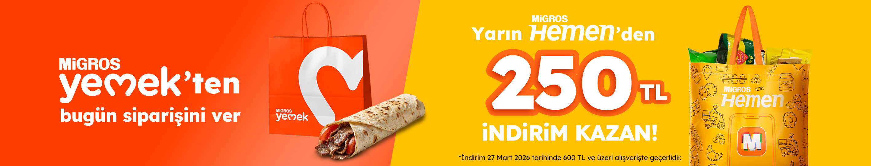 - Kampanya kapsamında 2 Nisan 2026 tarihinde verilecek Migros Yemek siparişi ile 3 Nisan 2026 tarihinde Migros Hemen'den verilecek 600 TL ve üzeri siparişte geçerli 250 TL indirim çeki hak edişi gerçekleşir.