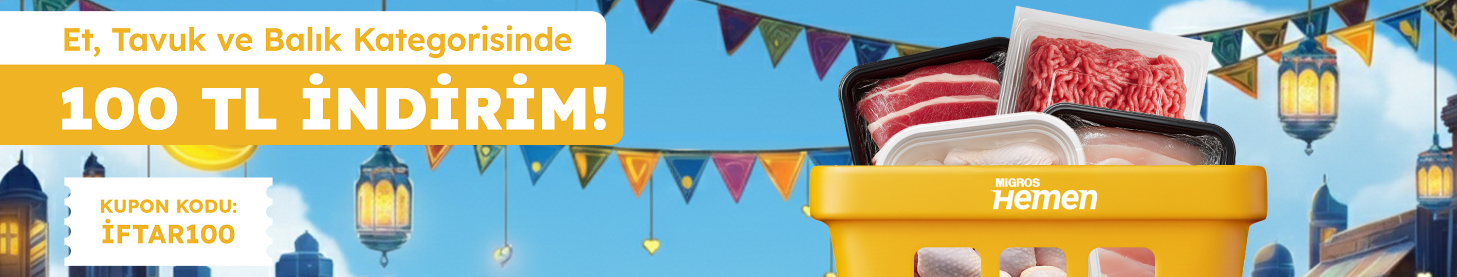 - Kampanya Et, Tavuk, Balık kategorisinden verilecek 500 TL ve üzeri siparişe "IFTAR100" kodu ile 100 TL indirim fırsatı sağlar.