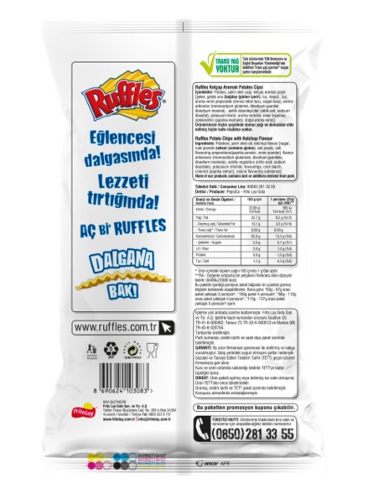 Frito Lay tarafından üretilen Ruffles cipsleri Türkiye'nin özenle seçilmiş patateslerini bir araya getirir. Tırtıklı bir yapıya sahiptir. En çıtır patateslerle hayatı en'lerde yaşayın sloganıyla tüketiciye ulaşan Ruffles'ın bu ürünü ketçaplı patates lezzetini sevenler için idealdir.