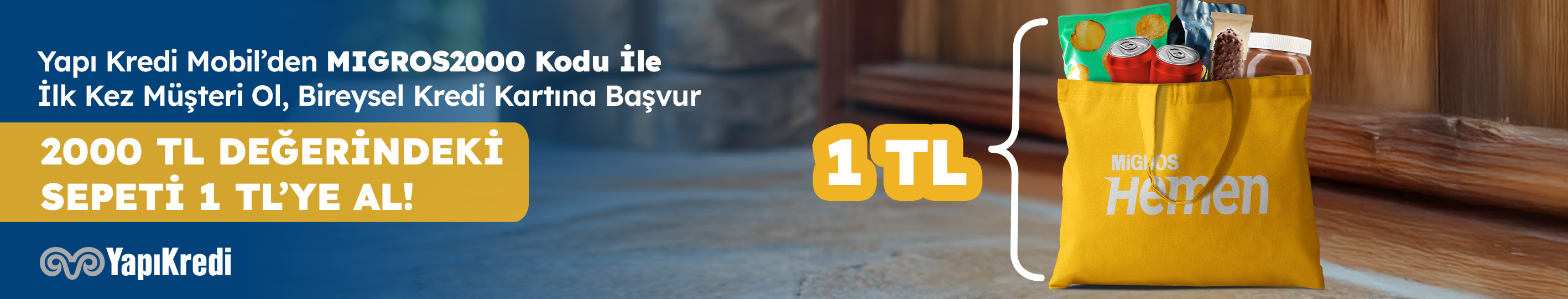 Yapı Kredi Mobil’den “MIGROS2000” koduyla yeni müşteri olanlara özel 2.000 TL değerindeki sepet 1 TL.