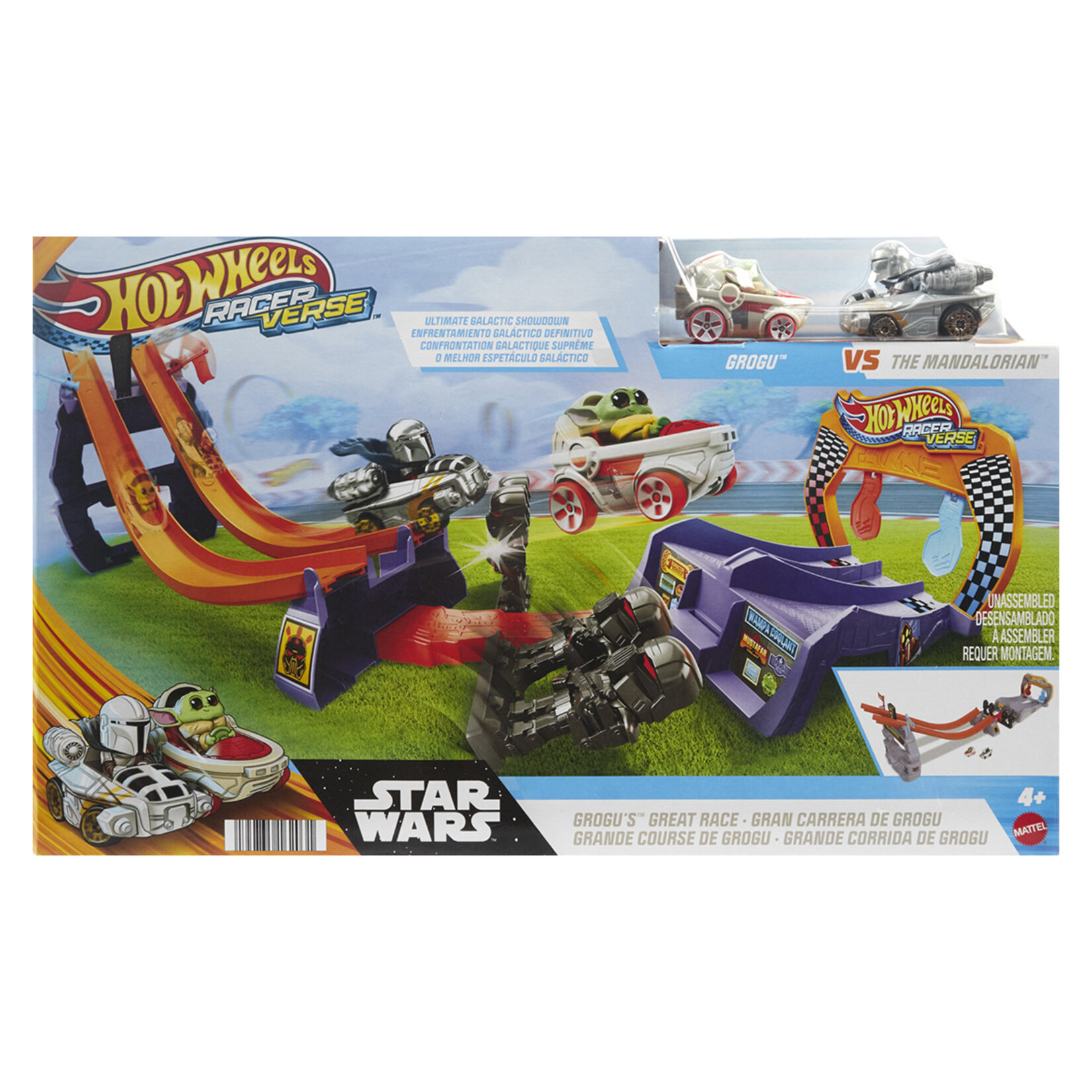 Hot Wheels RacerVerse Star Wars Pist Seti ile Hot Wheels RacerVerse™'de hız yapın! Star Wars™'tan ilham alan iki metal Hot Wheels RacerVerse™ aracı; Grogu™ ve Mandolorian™ dahildir.