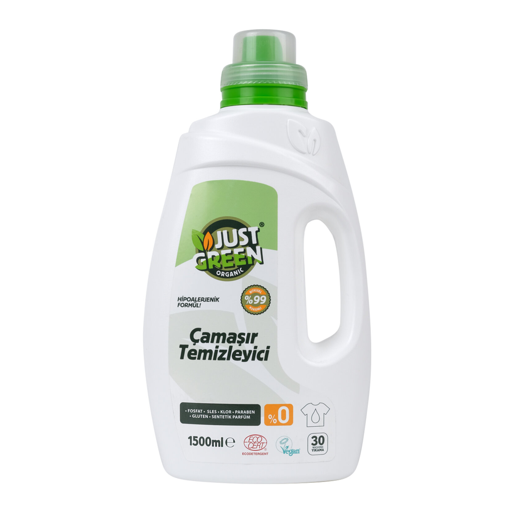 Just Green Organic Çamaşır Temizleyici, hem beyazlarda hem de renklilerde kullanılabilir. Yapısında herhangi bir kimyasal madde barındırmayan deterjan daha az su ile durulama imkanı sağlayarak su tasarrufu da sağlar.