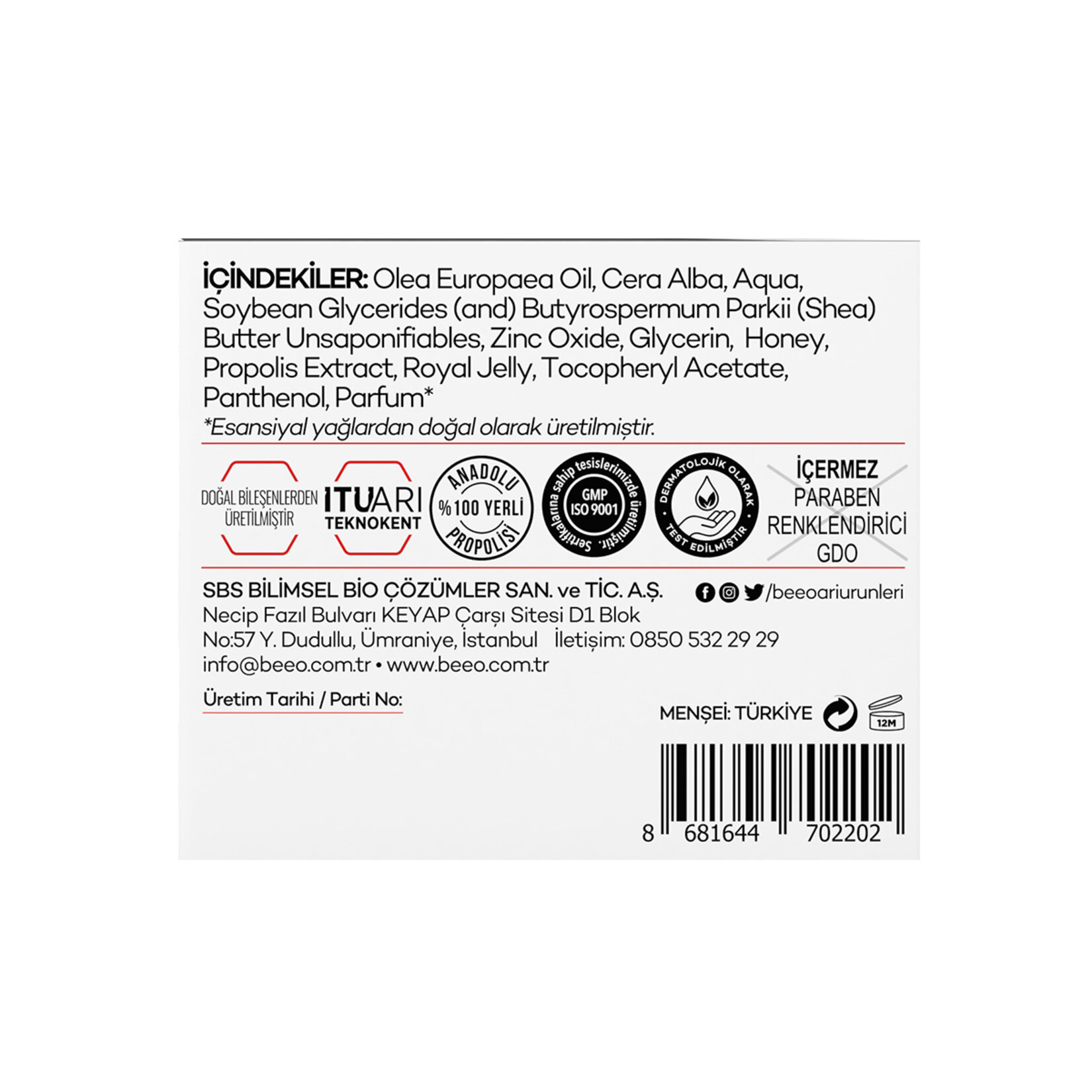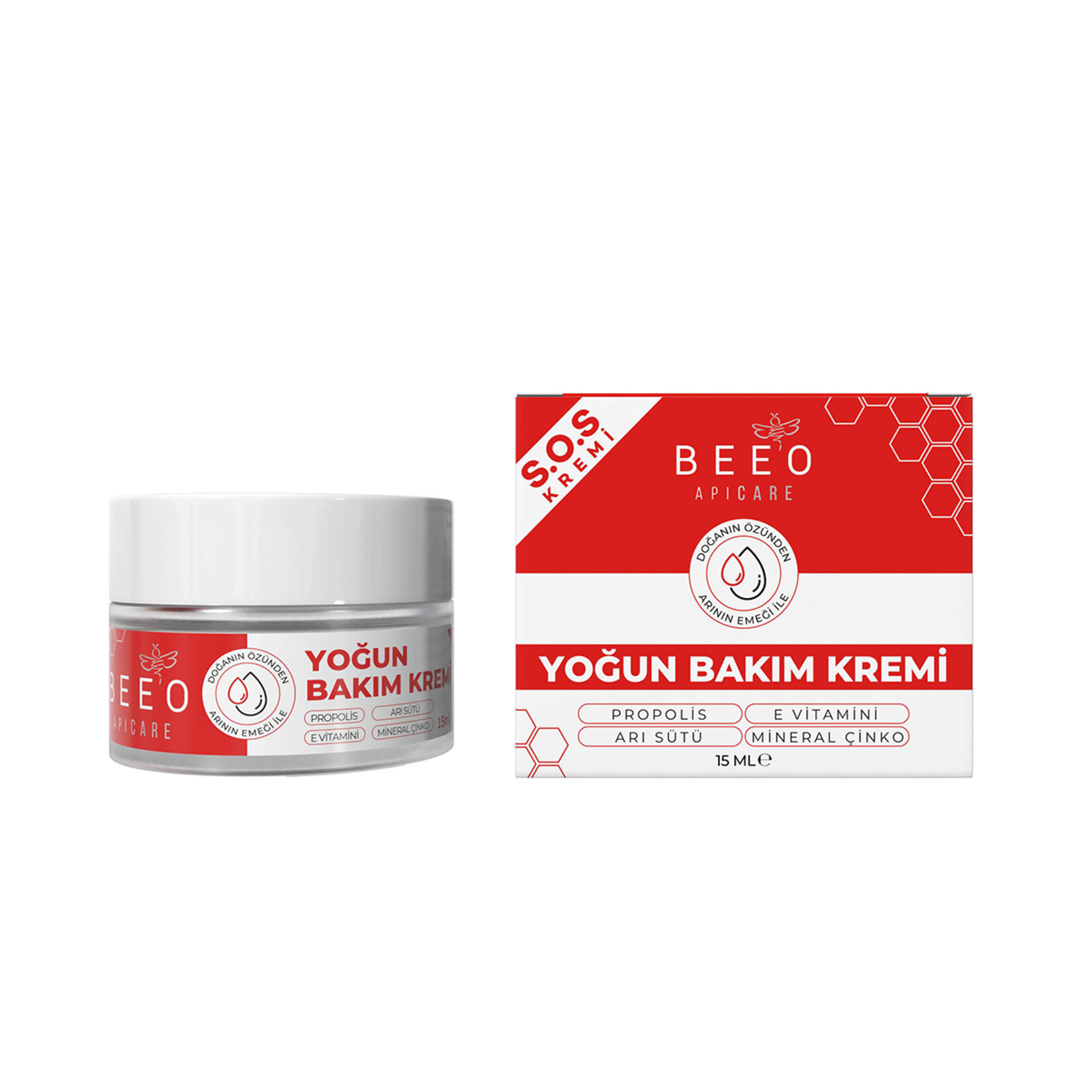 BEE’O APICARE SOS Yoğun Bakım Kremi ile cildinize ihtiyacı olan yoğun ve besleyici bakımı sağlayın! İçerisindeki propolis, zeytinyağı, ham bal ve arı sütü onarıcı rol üstlenirken; mineral çinko, B5 ve E vitaminleri ile cildinize ihtiyacı olan yoğun nem bakımını sağlar. Dermatolojik olarak test edilmiştir. Paraben, GDO ve renklendirici içermez. Hassas ciltlerin kullanımına uygundur, hipoalerjeniktir. Bu ürün helal sertifikalıdır. Onarıcı ve koruyucu doğal formülüyle cildin ihtiyacı olan yoğun nemi sağlar. Sözleşmeli arıcılık modeliyle, iyi arıcılık uygulamaları prensiplerine dayanarak, organik sertifikalı arı ürünleri kullanılarak üretilmiştir. Tüm ürünlerimizin formülleri Ar-Ge merkezimizde geliştirilmiştir, hepsi %100 doğal ve patentlidir ve ayrıca tamamı GMP, ISO 9000, ISO 22000, BRC, IFS, ISO 14001 ve COVID-19 güvenli üretim sertifikalarına sahip tesislerimizde paketlenmiştir. Etken Maddeler: Patentli Saf Anadolu propolisi, Arı sütü, B5 ve E vitaminleri, Ham bal, Hyalüronik asit, Mineral Çinko, ZeytinyağıArı sütü: Arıların kendi vücutlarından salgıladığı değerli bir arı ürünüdür. Arı sütü, yavru ve kraliçe arıların besinidir. Zengin besin bileşimi ile cilde yoğun bakım sağlarken derinlemesine nemlendirir. Ciltte kolajen sentezini destekleyen arı sütü, düzenli kullanımda cildin daha esnek ve canlı görünmesine yardımcı olur. Patentli BEE’O Saf Anadolu Propolisi: Yüksek antioksidan etki gösteren propolis, cilt bariyerinin temizliğini sağlarken cildi besler ve nem dengesini de korur.E Vitamini: Cildin doğal koruyucu bariyerini güçlendirerek yenilenmesine destek olur ve yoğun nem sağlar. Cildi yaşlanmaya karşı korur. Mineral Çinko: Hücre yenilenmesini destekleyen çinko minerali, cilt lekelerini giderir.