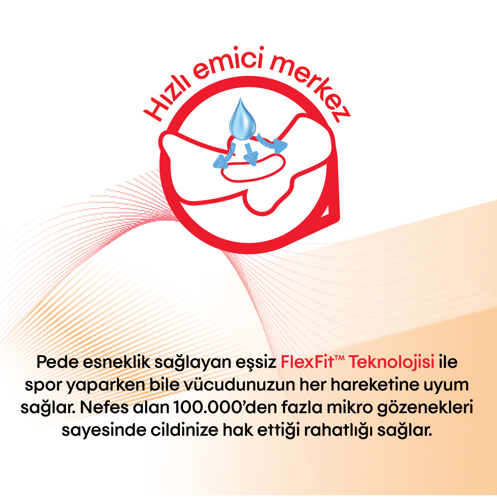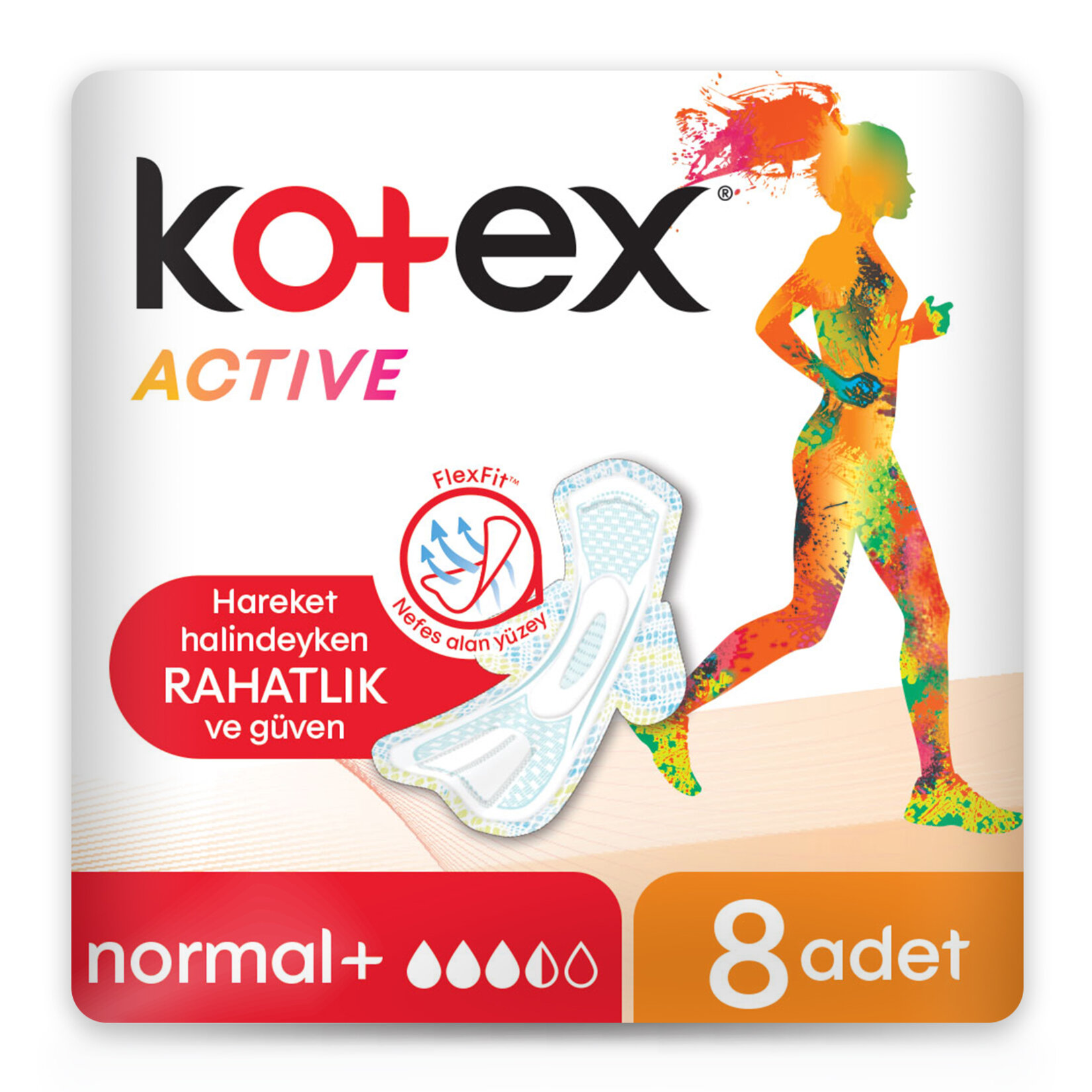 Kotex Active, pede esneklik sağlayan eşsiz Flexfit Teknolojisi sayesinde vücudunuzun her hareketine uyum sağlar ve her hareketinizde size rahatlık ve güven sunar. Hava alan mikro gözenekleriyle cildinize hak ettiği rahatlığı sağlar.