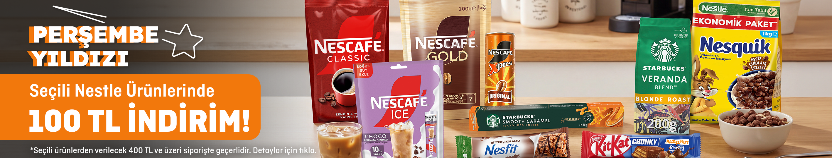 - Kampanya seçili Nestle ürünlerinden verilecek 400 TL ve üzeri siparişte 100 TL indirim sağlar.