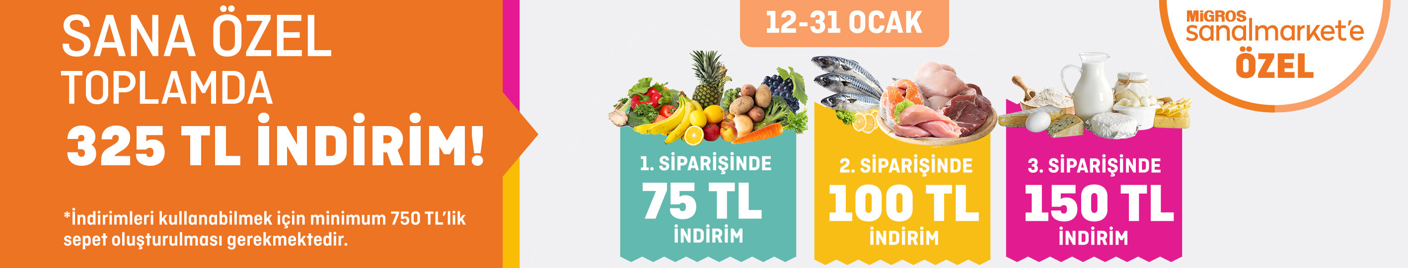 - 75 TL indirimi kullanabilmek için minimum 750 TL, 100 TL indirimi kullanabilmek için minimum 750 TL, 150 TL indirimi kullanabilmek için minimum 750 TL'lik sepet oluşturulması gerekmektedir.