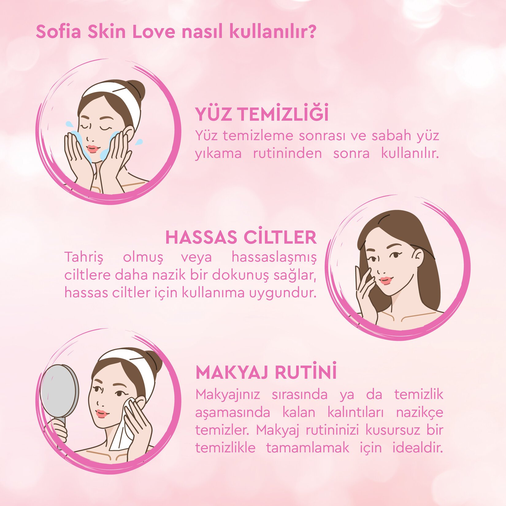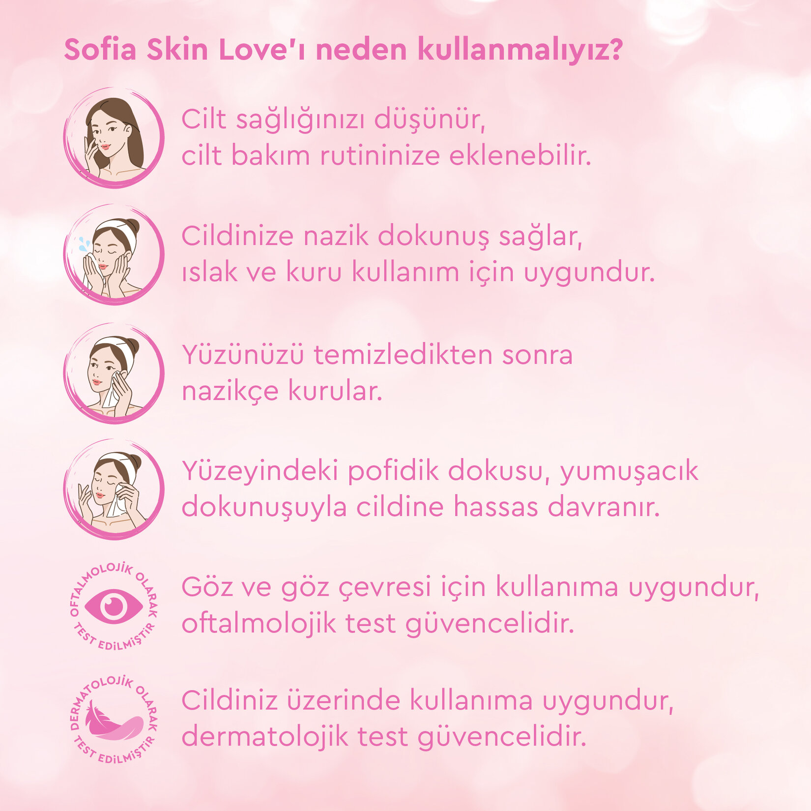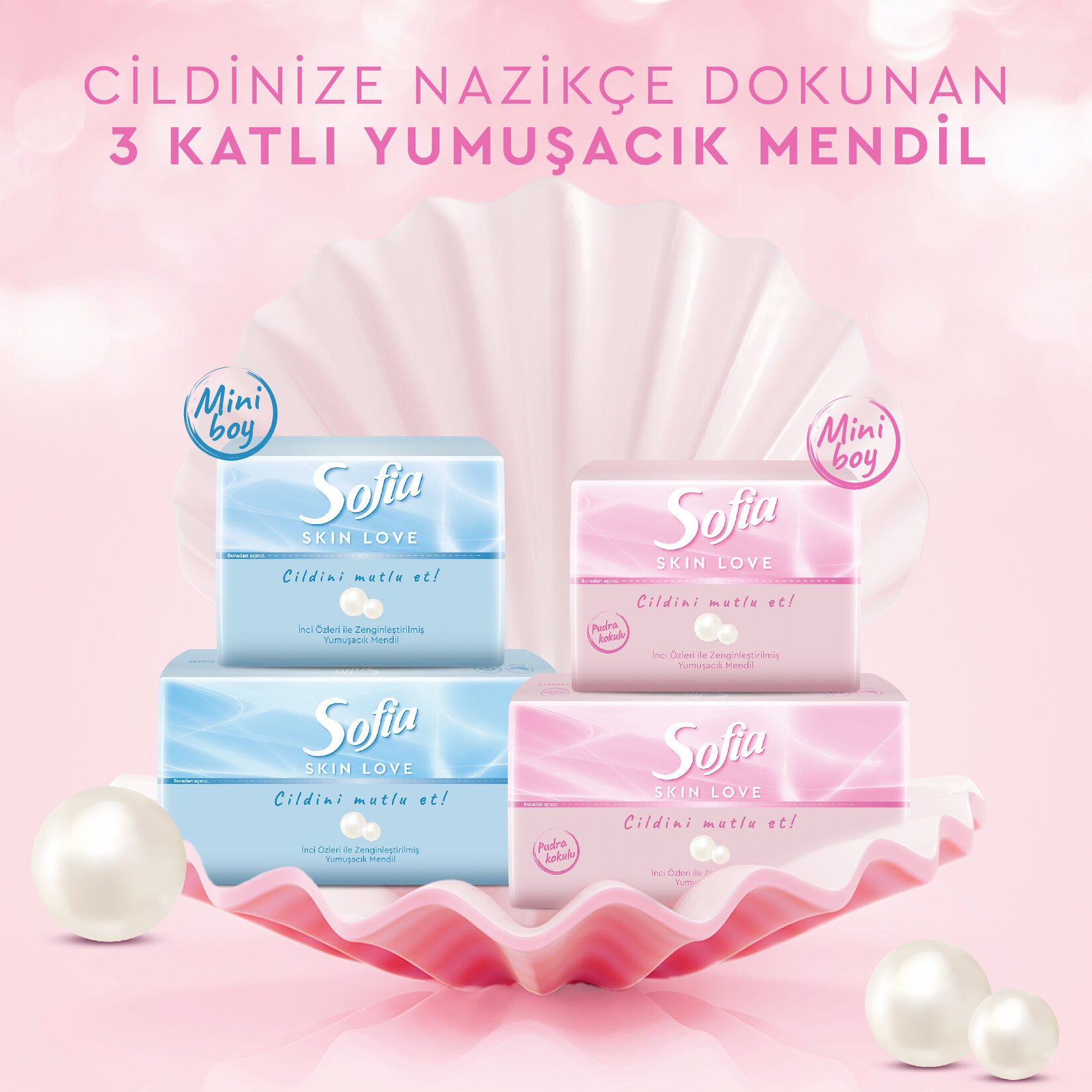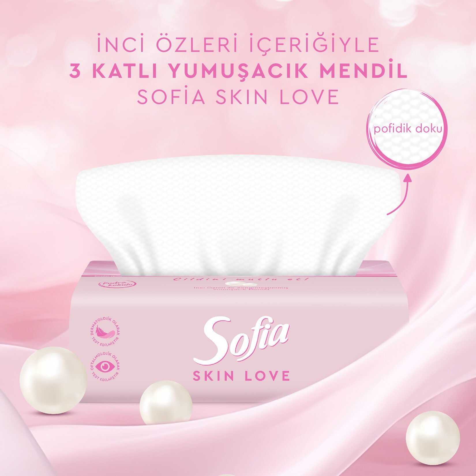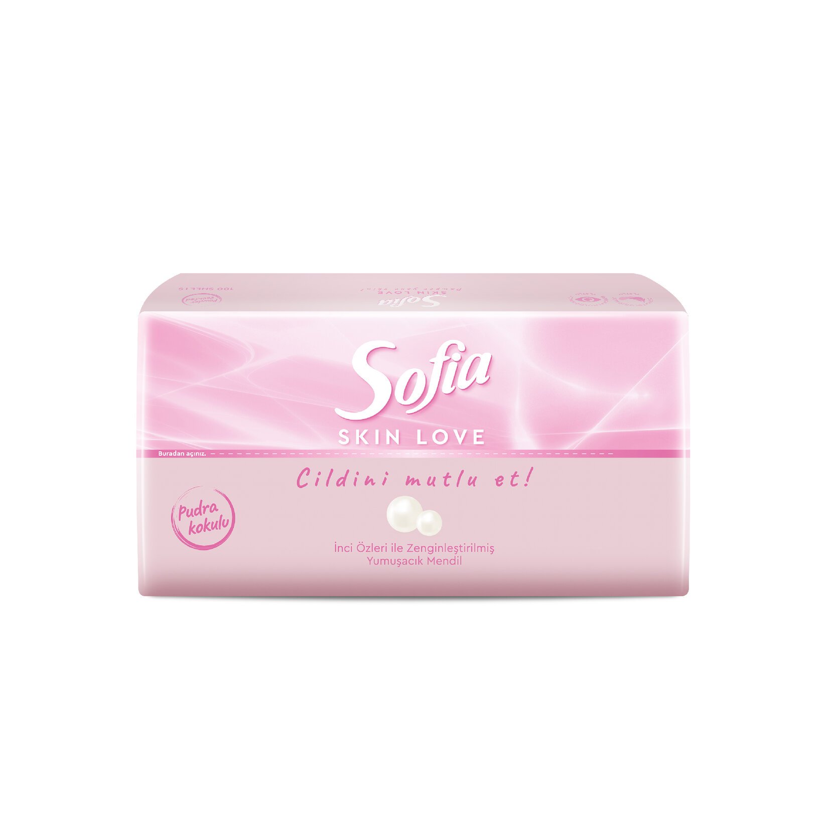 Sofia Skin Love yumuşacık mendil inci özleriyle zenginleştirilen içeriği ve nazik dokunuşu ile cilt bakım rutinini tamamlar.