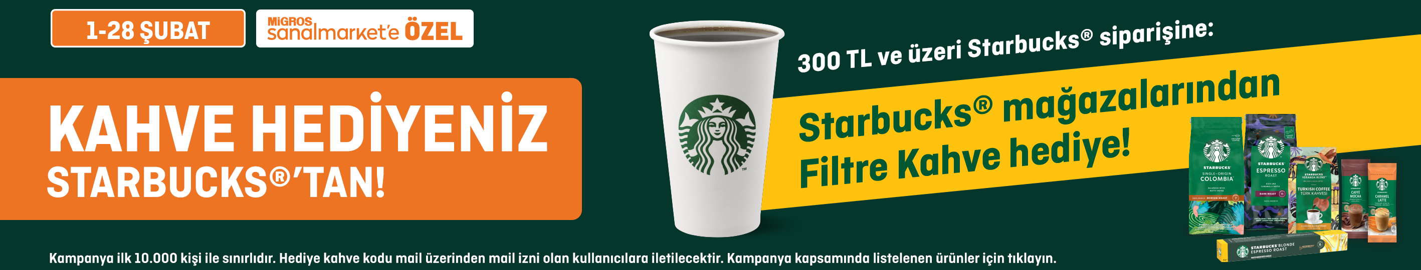 - Kampanya seçili Starbucks ürünlerinden verilecek 300 TL ve üzeri siparişte geçerli mağazalarda ücretsiz filtre kahve almak için kod sağlar.