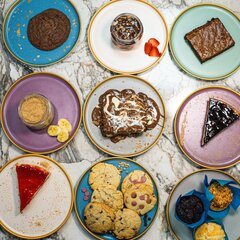 Brownie üzerine, Çevresi özel krema ile kaplanmış, Muz, Belçika Çikolatası, Fındık (Tabakta)