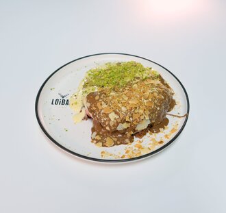 Alt tabanda kek, Üzerine günlük taze krema, Antep fıstığı kreması çıtır kadayıf ve tahin birleşimi, Belçika çikolatası, Antep fıstığı