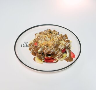 Günlük taze küp küp doğranmış pandispanya kek üzerine çilek, muz belçika çikolatası, krep kırığı ( Tabakta )