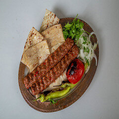1 şiş Adana kebap, 3 parça tavuk kanat, 1 şiş tavuk şiş, 2 şiş et, 2 şiş ciğer. Bulgur pilavı, tırnak pide, domates, yeşillik, közlenmiş biber, soğan ile