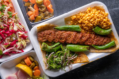 1 kg özel soslu çıtır tavuk, mevsim salatası, yeşil salata, çiğ köfte, karışık turşu, közlenmiş domates, közlenmiş biber, özel soslu lavaş