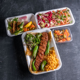 Adana veya urfa kebap, özel soslu kanat, özel soslu tavuk şiş, özel soslu çöp şiş, közlenmiş biber, közlenmiş domates, bulgur pilavı, mevsim salatası, yeşil salata, çiğ köfte, özel soslu lavaş (ürünler yarım porsiyon)