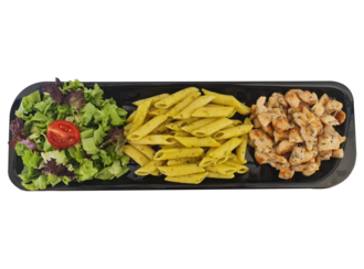 210 gr. sweet chili soslu tavuk, 150 gr. kremalı pesto soslu makarna, 80 gr. nar ekşili Akdeniz salata
