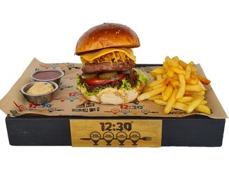 Taş fırında pişmiş burger ekmeğine, burger köftesi, kibrit patates, karamelize soğan, Akdeniz yeşiliği, sos, kornişon turşu, közde eritilmiş cheddar peyniri. küçük boy baharatlı patates tabağı, 2 adet özel sos ile