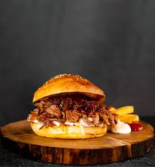 Uzun süre pişirilmiş, tiftiklenmiş dana eti, acılı BBQ sos. Coleslaw salata, patates kızartması ile