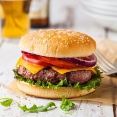 Brioche ekmeğine; burger köftesi, 2 adet cheddar peyniri, domates, marul, özel sos, karamelize soğan
