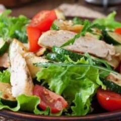 Izgara Tavuk Fileto, Kıvırcık, Roka, Salatalık, Kırmızı Soğan, Kırmızı Kapya Biber, Sarımsak, Maydanoz, Özel Salata Sosu, 2 Dilim Ekşi Mayalı Ekmek ile.