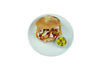 100 gr. tavuk göğüs, rende kaşar, domates, marul, Albero sos. Patates kızartması, 2 adet soğan halkası, ketçap, mayonez ile gönderilir.