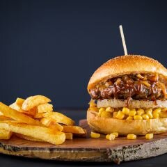 100 gr. dana hamburger köftesi, ızgara ananas, BBQ sos, karamelize soğan, mısır taneleri, patates kızartması
