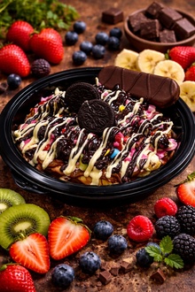 Tatlı krizlerinizi bastıracak, bol malzemeli ve çıtır çıtır waffle dilimleri. Üzerine eklenen taze meyveler ve çikolata sosuyla tatlı bir şölen.