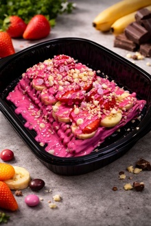 Özel kesilmiş Belçika hamuru, çilek, kivi, muz, frambuaz, çikolata, beyaz çikolata, jelibon, kırık fındık ve damla karışık