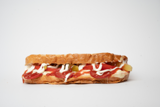 Sucuk, kaşar peyniri, amerikan salatası, turşu, salam, ketçap, mayonez ve domates