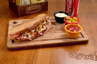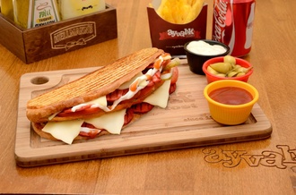 Çift katlı Ayvalık ekmeğine; kaşar peyniri, sucuk, domates, turşu,ketçap,mayonez