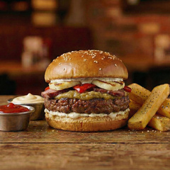 150 gr. dana burger köftesi, cheddar peyniri, mozzarella stick, sote mantar, ranch sos, baharatlı patates kızartması ile