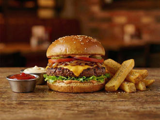 150 gr. dana burger köftesi, domates, göbek marul, turşu, cheddar peyniri, karamelize soğan, burger sos, baharatlı patates kızartması ile