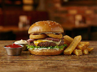 150 gr. dana burger köftesi, füme kaburga, soğan halkası, cheddar peyniri, kaşar peyniri, ranch sos, baharatlı patates kızartması ile
