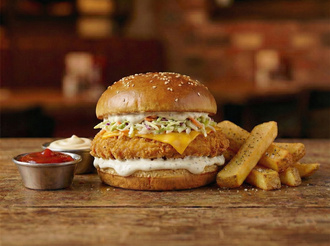 Çıtır tavuk, coleslaw, cheddar peyniri, ranch sos, baharatlı patates kızartması ile