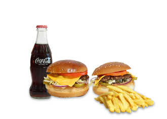Köfte Burger (marul, domates, ketçap, turşu, özel sos ) + Tavuk Burger (marul, mayonez) + Patates Kızartması + İçecek (1 L.)