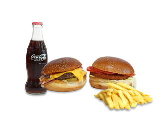 2 adet burger dana burger köftesi, özel sos, ketçap, marul, domates, turşu, karamelize soğan, cheddar peyniri. Patates kızartması ile