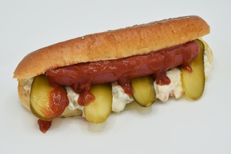 130 gr. sosis, Amerikan salatası, patates kızartması, domates, salatalık turşusu