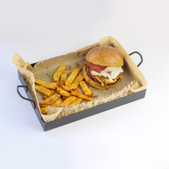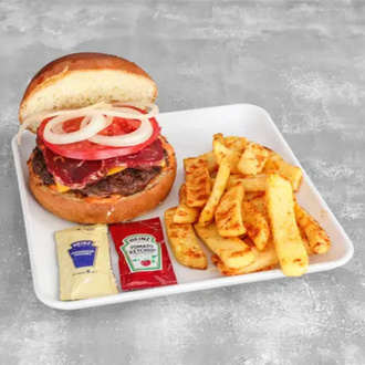 120 gr El Yapımı Burger Köftesi, Füme Et, Pastırma, Cheddar Peyniri, Soğan Halkası, Burger Sos, Karamelize Soğan, Turşu + Patates Kızartması ile servis edilir.