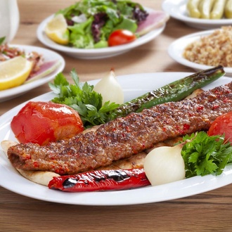 500 gr. zırh kebabı saplanmış, sebzeli bulgur pilavı, köz domates,köz biber, köz soğan,soğan salatası,soslu lavaş,tırnak pide.Günün mezeleri ve kemalpaşa tatlısı ile.