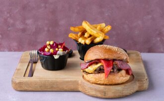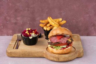 Dana eti, Cherry sos, Çift cheddar peyniri, Patates kızartması