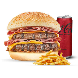 Triplex Burger + Patates Kızartması + Kutu İçecek + 2 Adet Sos