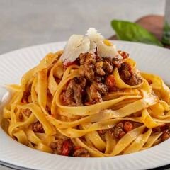 Ev yapımı hamburger köftesi, cheddar peyniri, dana jambon, göbek marul, karamelize soğan, özel sos, barbekü sos. Patates kızartması ile